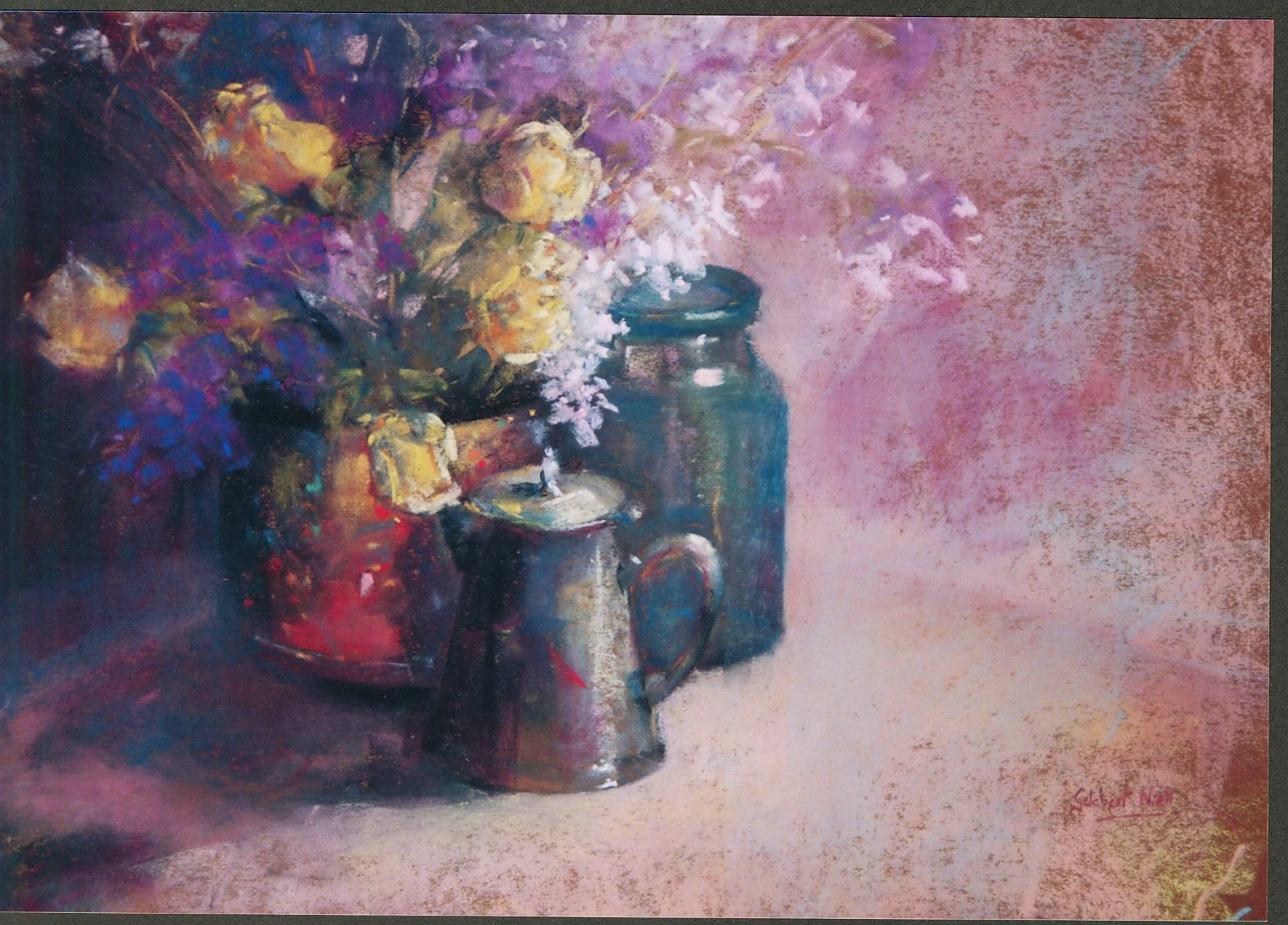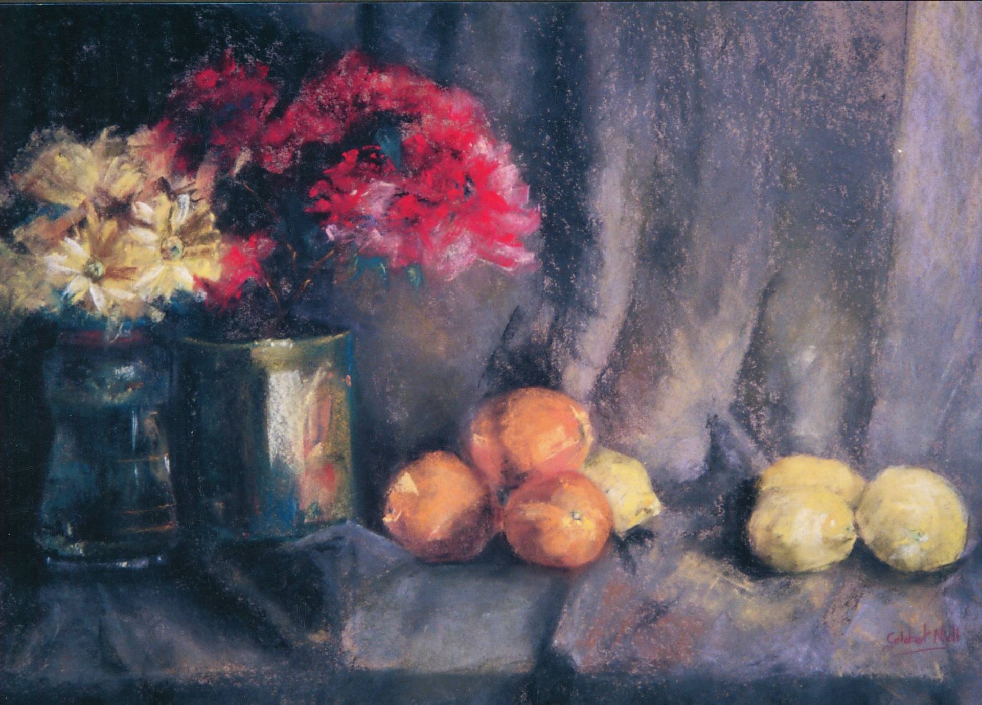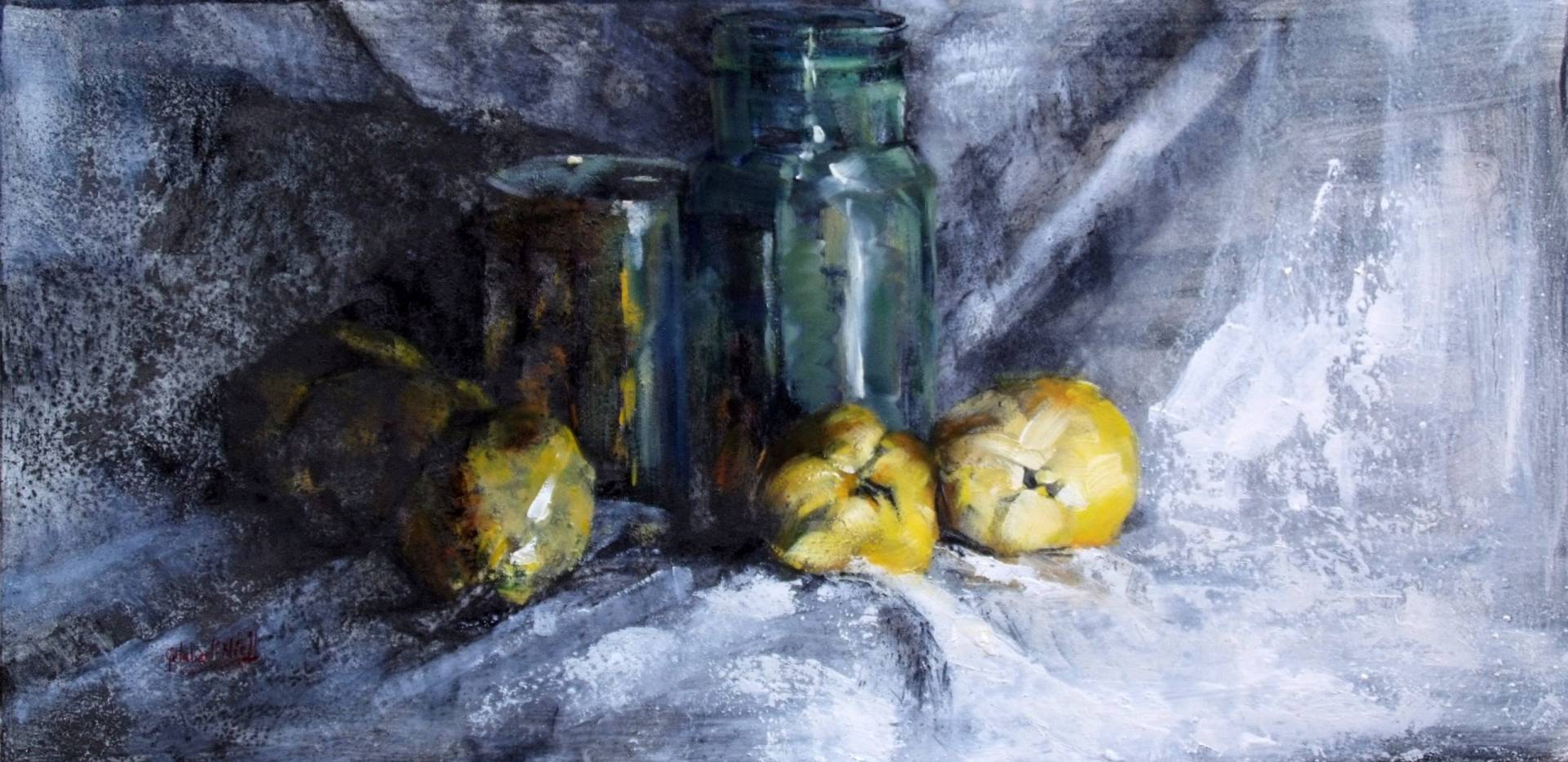 Botes y membrillos,Oleo y grafito sobre tabla,66x33cm