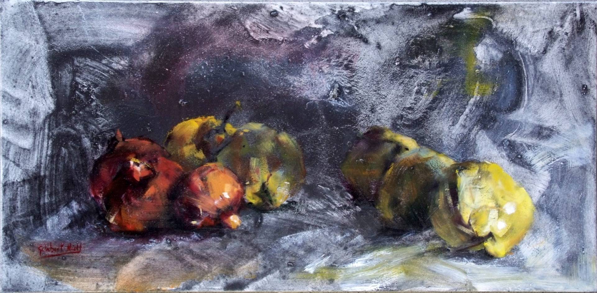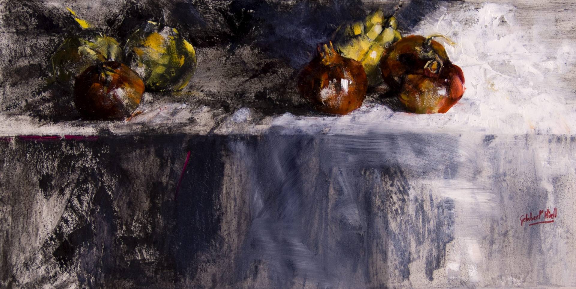 Granadas y membrillos I,Oleo y grafito sobre tabla,55x27cm
